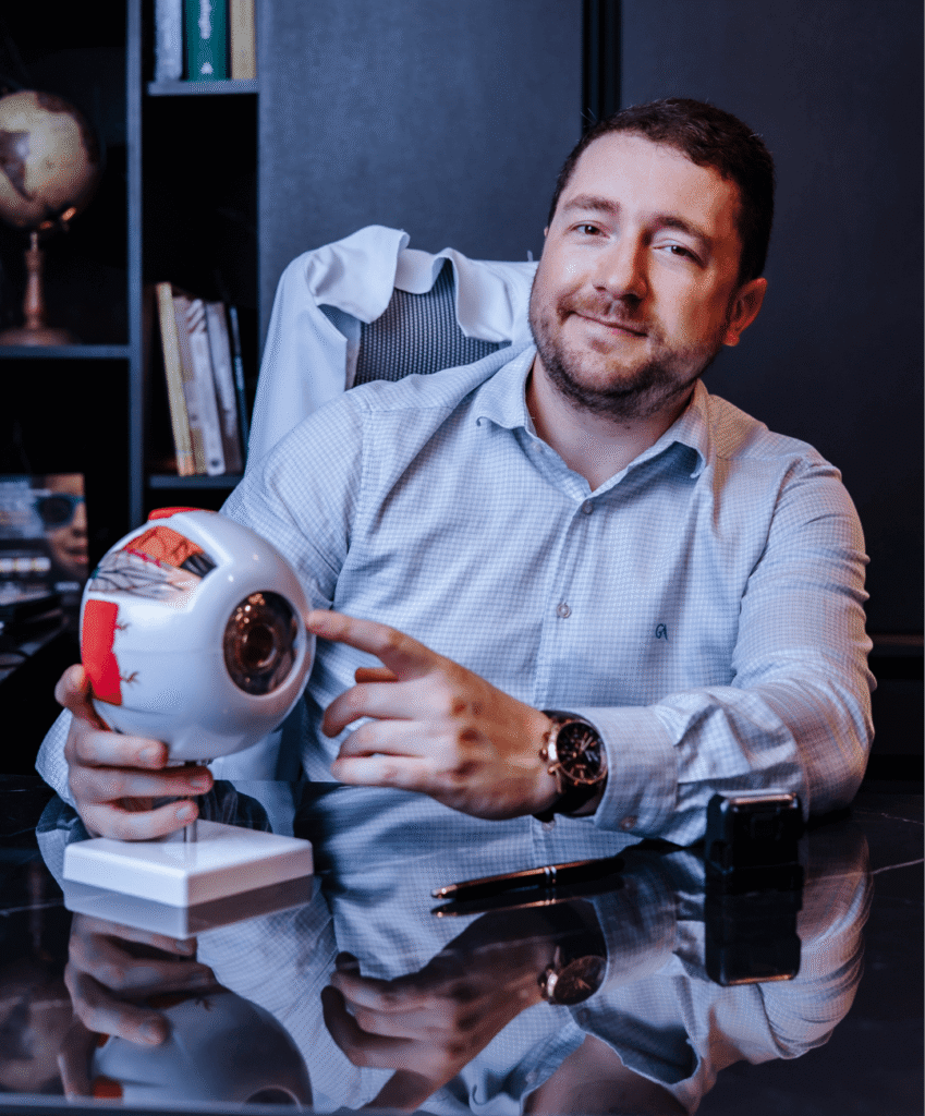 Teve sua história com a oftalmologia iniciada de forma pessoal quando, anos atrás, passou por uma cirurgia para correção de um alto grau de refração.